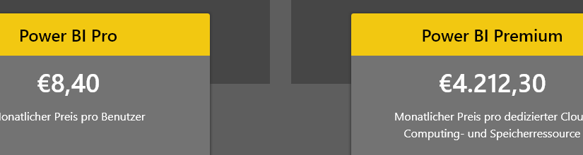 Sie können aber auch 20 Power BI Pro-Lizenzen und eine Power BI Premium P1-Kapazität kaufen und Geld sparen. Die monatlichen Kosten betragen dann 168,00€ für die Power BI Pro Lizenzen und 4.212,30€ für die Power BI Premium Kapazität.