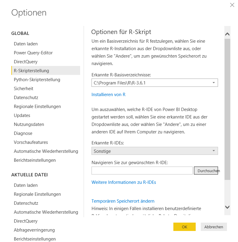 Wählen Sie R-Skripterstellung und prüfen Sie, dass das erkannte R-Basisverzeichnis mit dem R-Speicherort aus der Installation übereinstimmt.