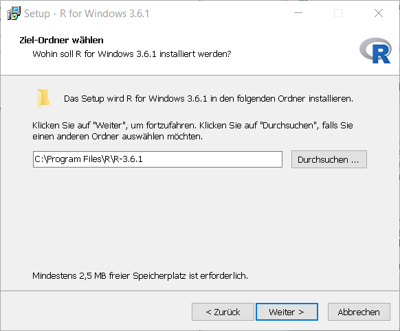 Zuerst laden Sie R für Windows von der Webseite https://cran.r-project.org/bin/windows/base/ herunter.