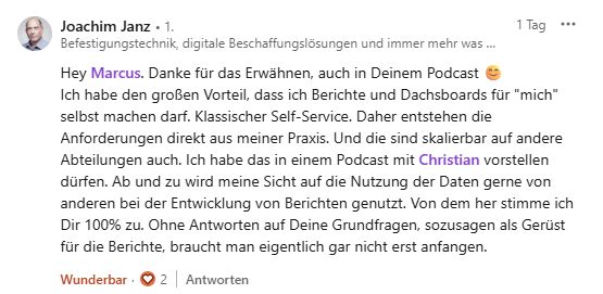 Joachim hat beschrieben, dass er einen großen Vorteil darin sieht, selbst sein eigener Anforderer zu sein. Er kennt die Praxis. Er weiß, welche Fragen er beantworten möchte. Dadurch entstehen Dashboards, die zielgerichtet sind und gleichzeitig skalierbar auf andere Bereiche mit ähnlichen Fragestellungen. Ohne ein klares Gerüst an Grundfragen, so seine Haltung, braucht man mit der Berichtserstellung eigentlich gar nicht erst anfangen.