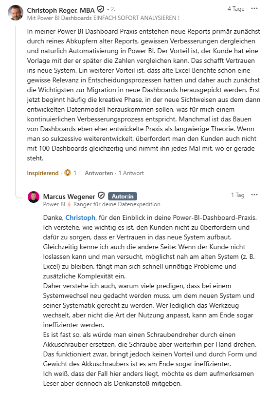 Christoph hat aus seiner Power-BI-Praxis einen weiteren Aspekt eingebracht: Alte Excel-Reports als Grundlage zu nutzen, schafft Vertrauen. Zahlen bleiben vergleichbar. Der Übergang wird kleiner. Die Akzeptanz steigt. Er beschreibt das weniger als radikalen Neubeginn, sondern eher als evolutiven Prozess: Erst Stabilität und Vergleichbarkeit schaffen, dann schrittweise neue Perspektiven aus dem Datenmodell entwickeln. Dashboard-Bau ist für ihn häufig eher entwickelte Praxis als langwierige Theorie, ein kontinuierlicher Verbesserungsprozess.